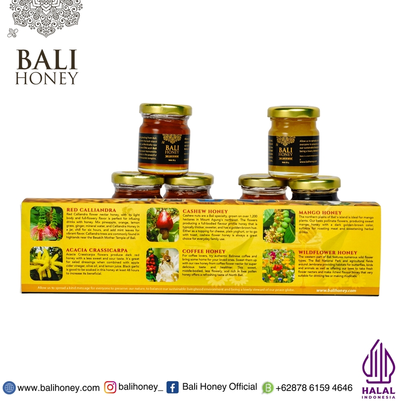 Terdiri dari 6 jenis nektar madu dalam jar kaca 55 gram: Calliandra, Acacia, Cashew, Coffee, Mango, Wildflowers (tergantung apa yang diberikan alam). Sangat cocok untuk hadiah (gift box) kepada orang terdekat.