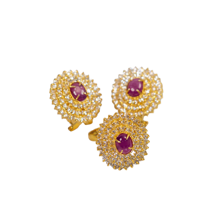 Kalung kebun raja mirah merupakan set kalung silver 925 yang terdiri dari kalung anting dan bross berbahan dasar perak yang di gold plated dan dihias dengan batu pertama mirah dan sirkon