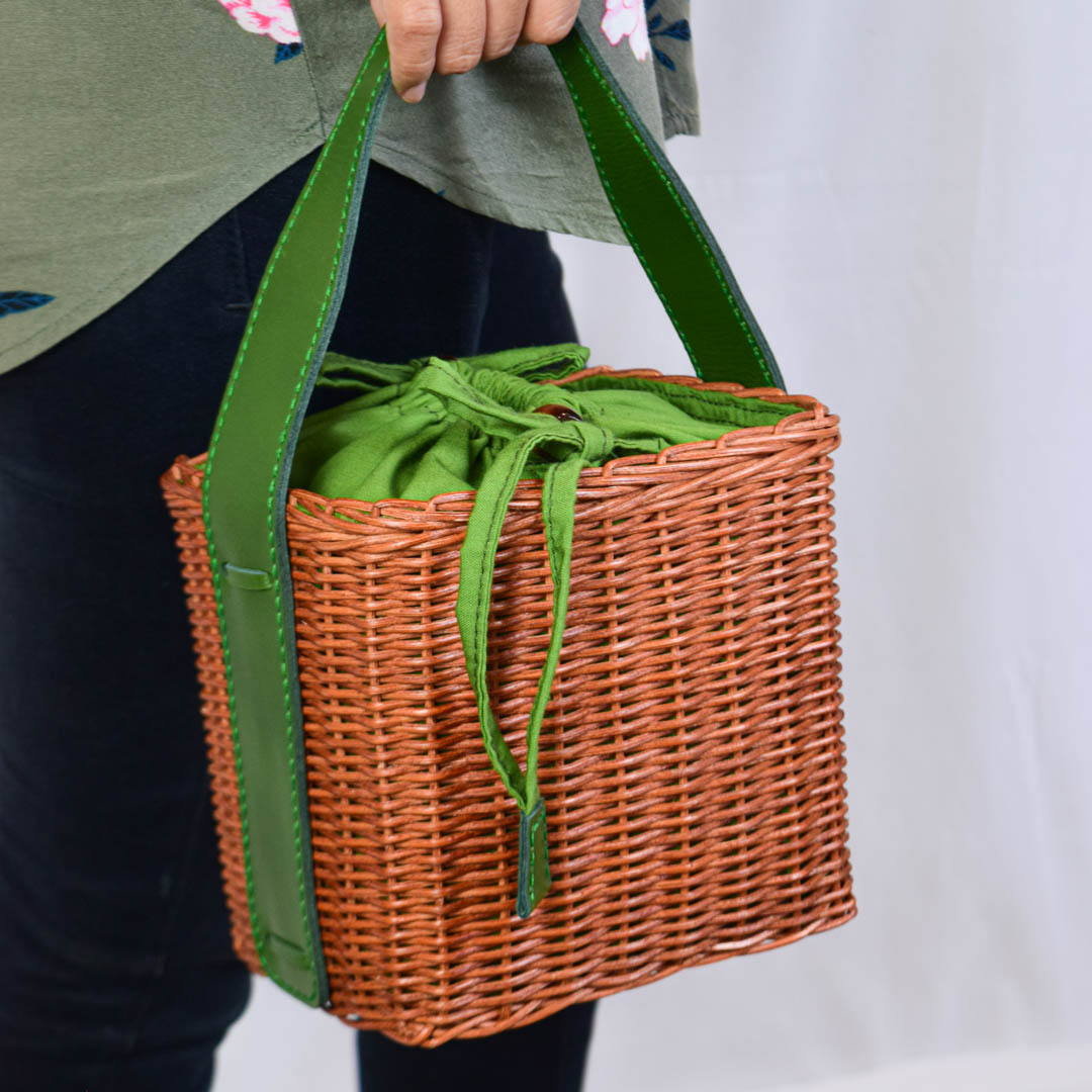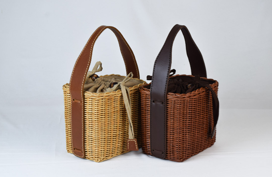 ANYAMAN rotan membentuk kubus dan potongan kulit yang menempel di kedua sisi bodinya menjadikan Yerui tas jinjing yang bernuansa simple.