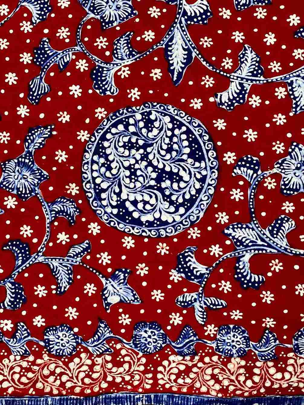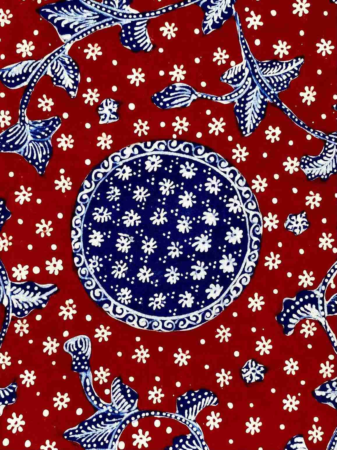 Makna Motif: Sekar Jagad (Bunga Bumi) merupakan motif macam macam flora khas lasem yang melambangkan hubungan yang harmonis antara munusia dan alam. Bang Biron (Merah Biru) merupakan salah satu kombinasi warna batik klasik Lasem.