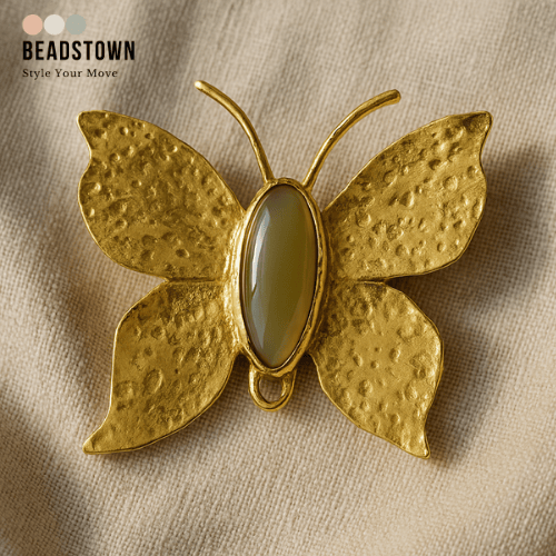 Dirancang dengan indah menyerupai kupu-kupu yang tengah terbang, bros "Kupu-Kupu Terbang" memadukan sayap bertekstur dengan lapisan emas (gold plated) dan batu pusat yang halus. Melambangkan transformasi dan keanggunan, aksesori ini menghadirkan pesona dan semangat pada setiap penampilan.