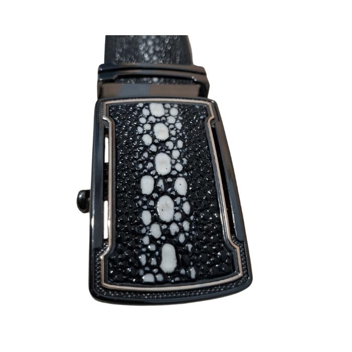 Jenis Bahan: Bagian depan memakai kulit ikan pari duri Bagian belakang memakai kulit sapi box Gesper anti karat