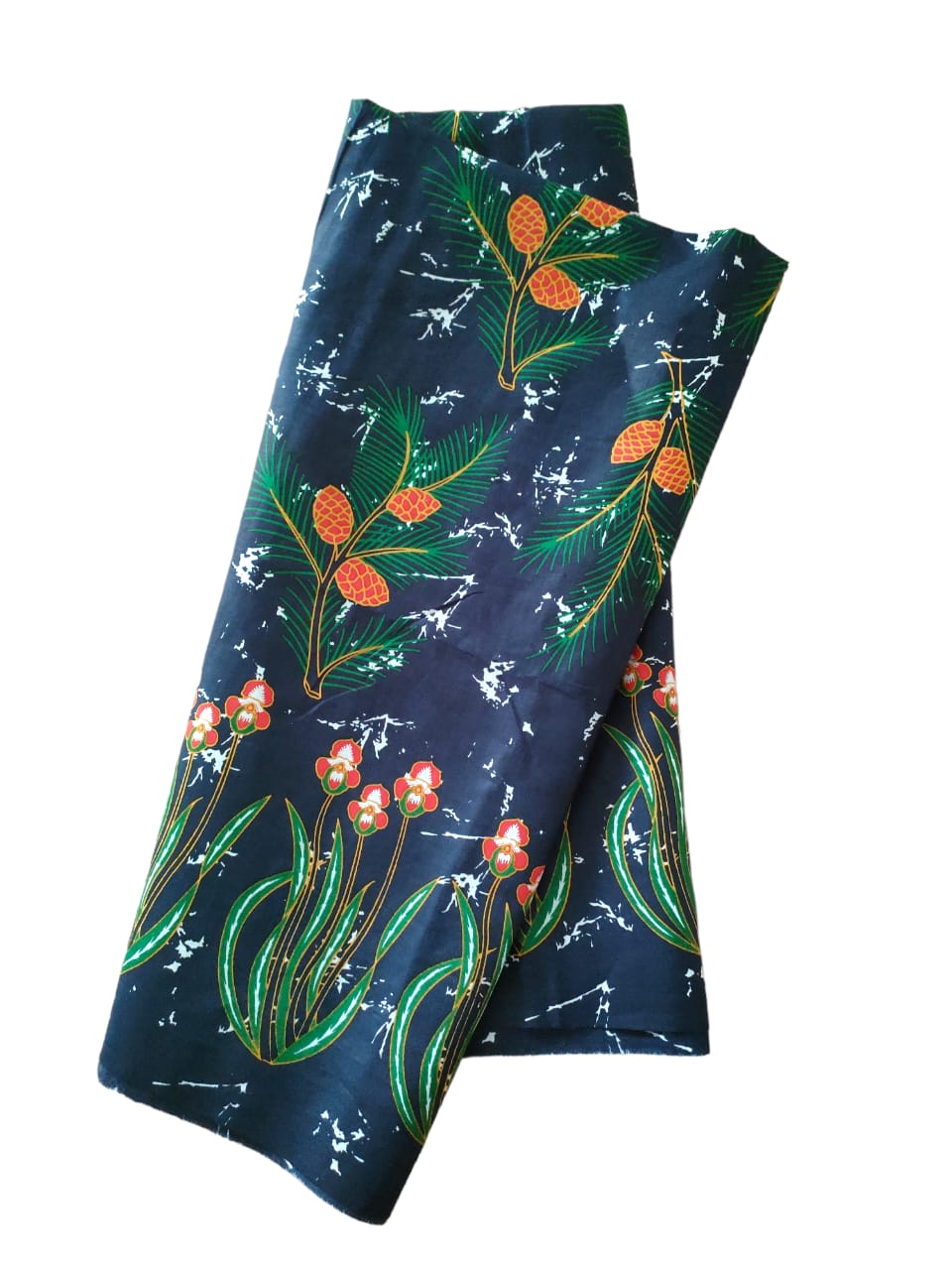 Makna Motif: Buah ru disebut juga cemara laut umumnya ditemukan di wilayah tepi pantai Pulau Belitung. Ranting pohonnya berbentuk seperti jarum dengan panjang dapat mencapai sekitar 30cm. Daun cemara juga memiliki bintik seperti sisik dan tersusun melingkar dengan jumlah 6-10 helai. Pada saat berbuah, akan mendapati buahnya berbentuk kerucut bulat memanjang dan di dalamnya terdapat banyak biji bersayap. Motif ini menggunakan tumpal motif anggrek bulan. Daunnya berwarna hijau dengan bentuk memanjang. Bunganya memilik sedikit keharuman dan waktu mekar yang lama serta dapat utmbuh hingga diameter 10 cm lebih. (The fruit "ru" is also known as "cemara laut" and is commonly found in coastal areas of Belitung Island. Its tree branches are needle-like, reaching a length of approximately 30cm. The leaves of the "cemara" also have scale-like spots and are arranged in a circular pattern with 6-10 pieces. When it bears fruit, the fruit takes on a long, conical shape with many winged seeds inside. This motif uses the "tumpal" motif of the moon orchid. Its leaves are green and elongated, while the flowers have a slight fragrance, long blooming time, and can grow up to a diameter of more than 10 cm)