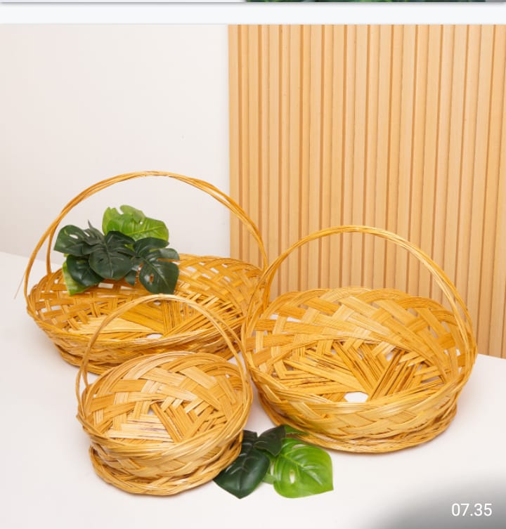 Keranjang serbaguna yang bisa dibuat sebagai contohnya parsel buah, jajan, dan hiasan rumah lainnya.