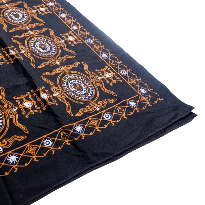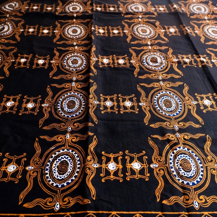 Makna Motif: Motif Kekehang Besar menggambarkan cumi-cumi atau gurita dalam skala dominan, simbol kekuatan, kelincahan, dan hubungan erat masyarakat Maluku dengan laut. Garis-garis dinamis mewakili adaptasi dan ketahanan, sementara ukurannya yang besar menjadi pernyataan identitas dan penghormatan terhadap budaya pesisir yang kaya dan terus hidup.