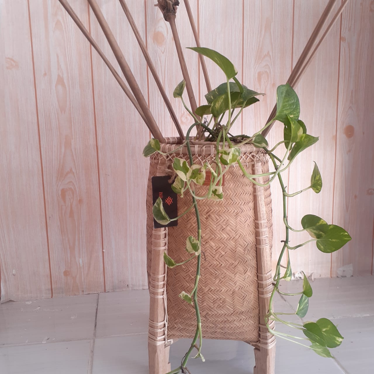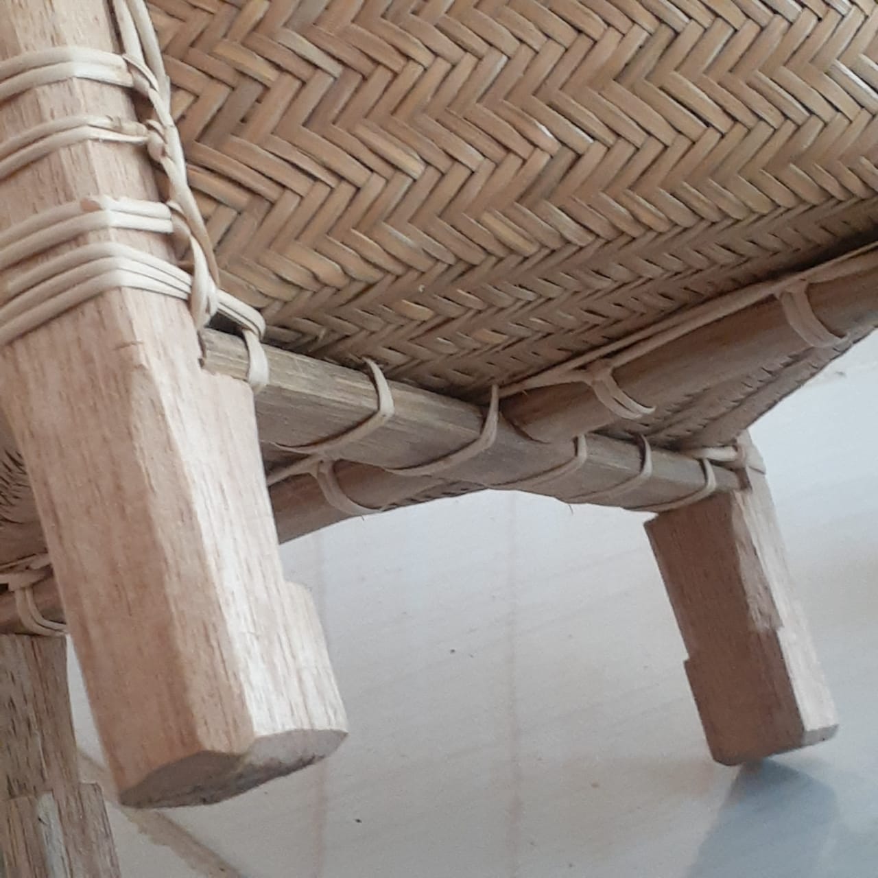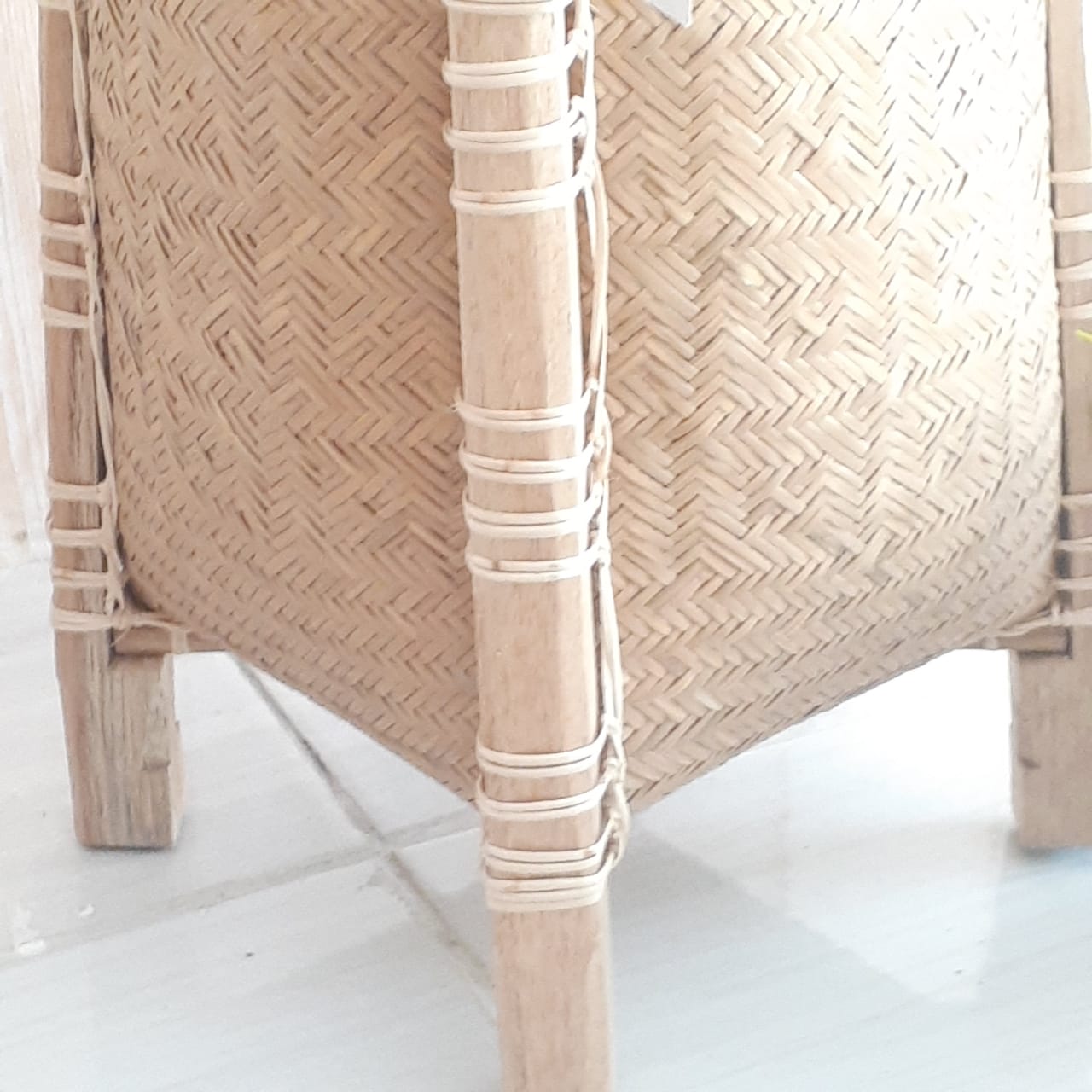 Anyaman Kulit Bili/bemban Yang Di Bentuk Menjadi Keranjang Anyaman Yang Rapi Secara Finishing, Terdapat 4 kaki kayu dan memiliki kayu 2 pengangah yang selang di bagian bawah anyaman.