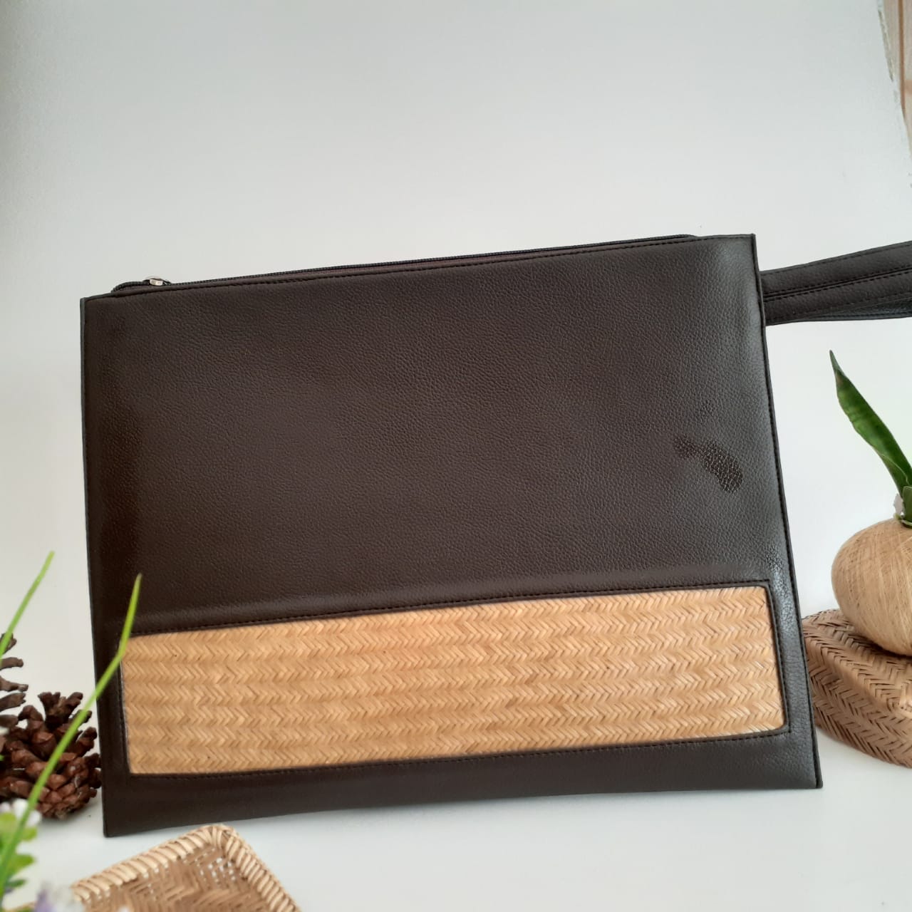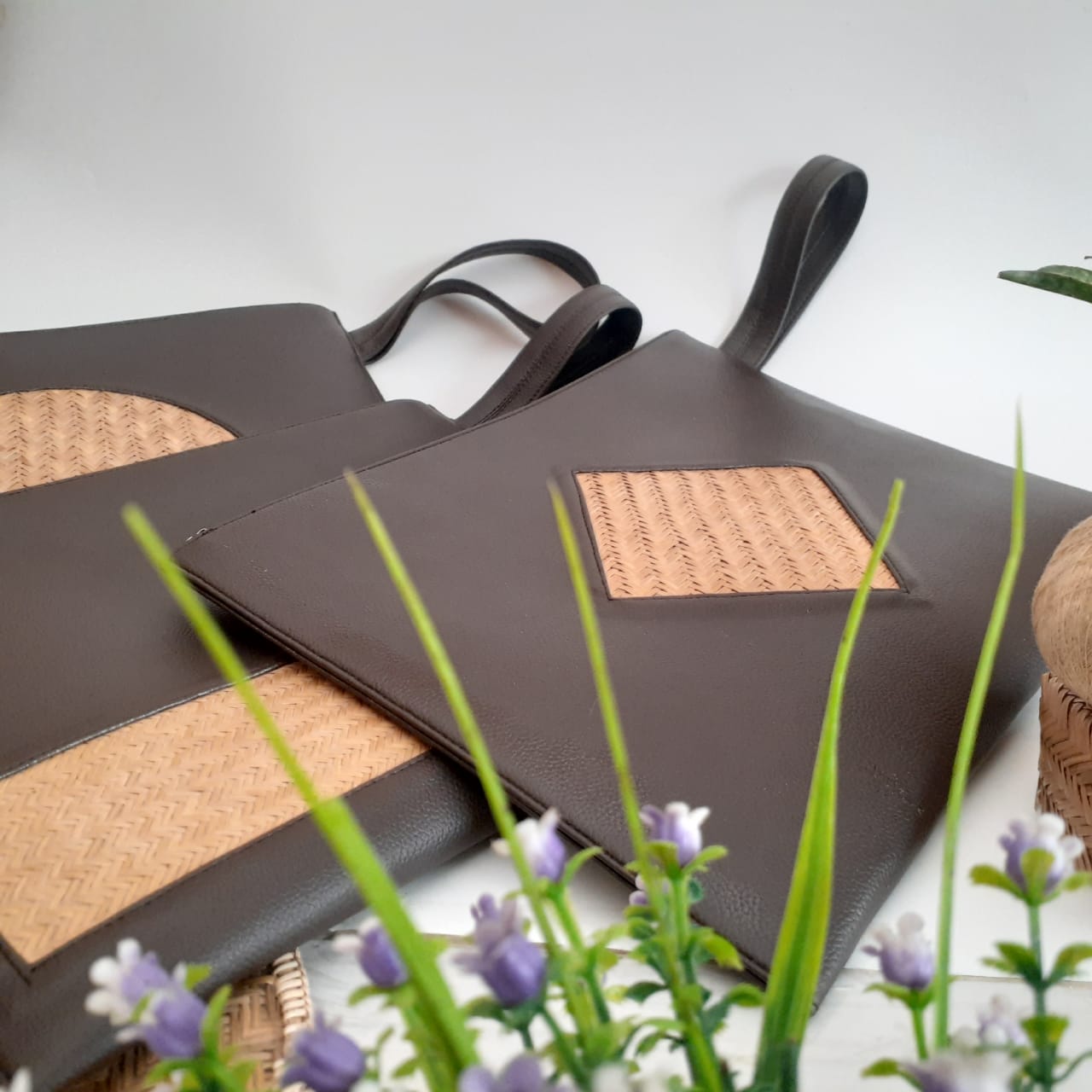 Anyaman Kulit Bili/bemban Yang Di Jahit Dengan Kombinasi Kulit Sintetis Mengunakan Mesin Jahit Industri.