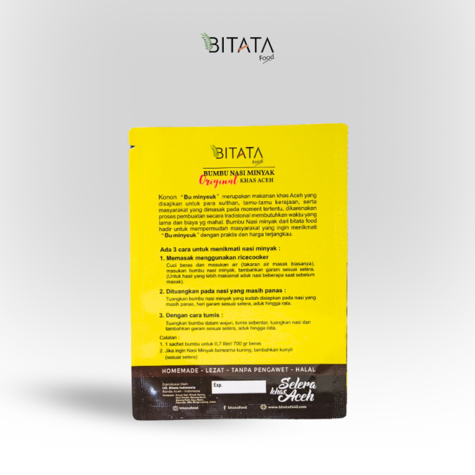 Bumbu nasi minyak merupakan makanan khas aceh yang disajikan untuk para sultan, tamu kerajaan, serta masyarakat yang dimasak pada moment tertentu seperti acara pernikahan. dikarenakan proses pembuatan secara tradisional membutuhkan waktu yang lama dan biaya yang tinggi. Bitata food hadir dengan inovasi bumbu nasi minyak dengan kemasan menarik, praktis dan harga terjangkau. Bumbu nasi Minyak di produksi menggunakan resep warisan nenek moyang (nektu) yang diproses menggunakan rempah pilihan indonesia yang berkualitas dan sudah teruji proses produksinya. Bumbu nasi minyak dapat menambah nafsu makan anak dan sudah memiliki setifikat halal.