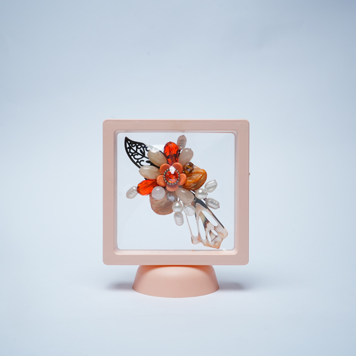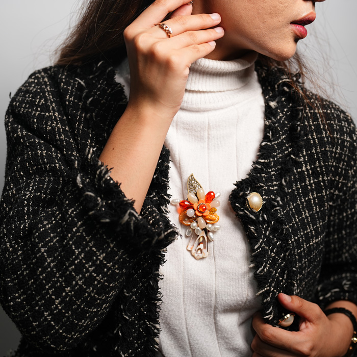 “Amber Bloom” menghadirkan nuansa hangat musim gugur dalam bentuk bros elegan. Perpaduan warna oranye, emas, dan krem menampilkan bunga cantik di tengah, dihiasi manik-manik mutiara, kristal, dan batu alam. Ornamen daun vintage dan bentuk abstrak di bagian bawah menambah kesan artistik. Cocok untuk acara formal, pesta, atau pernyataan gaya yang anggun dan berani.