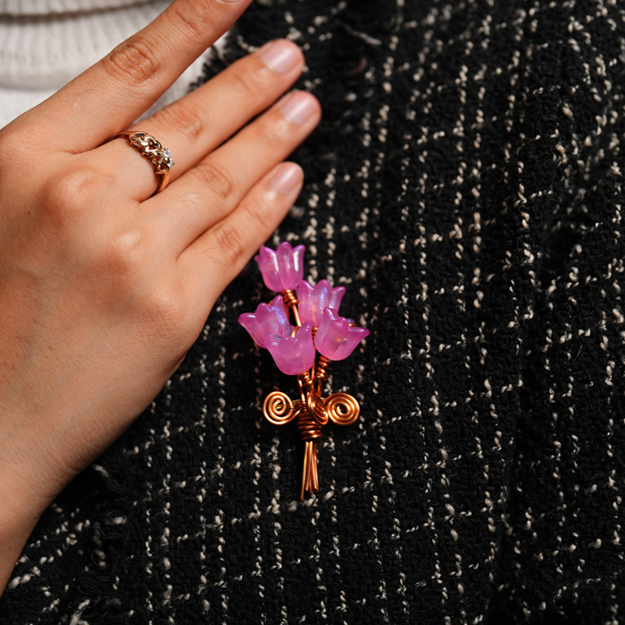 Jenis Bahan: – Bunga tulip dari resin transparan warna pastel – Kawat tembaga berlapis emas handmade – Peniti logam stainless steel antikarat