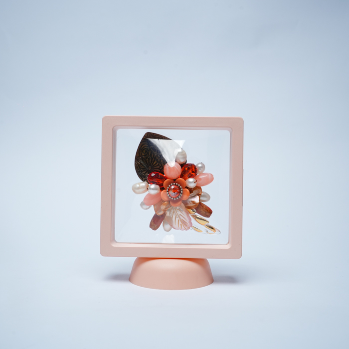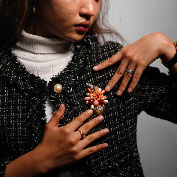 Bros ini memancarkan kehangatan musim gugur dalam bentuk karya seni yang elegan. Perpaduan warna oranye, emas, dan krem menampilkan bunga cantik sebagai pusat perhatian, dihiasi manik-manik mutiara, kristal, dan batu alam. Ornamen daun bergaya vintage dan bentuk abstrak di bagian bawah menambah nuansa artistik dan mewah. Sangat cocok dikenakan untuk acara formal, pesta, atau sebagai pernyataan gaya yang berani namun tetap anggun.