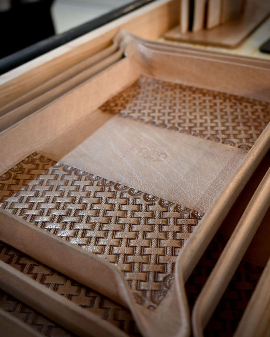 Dibuat dengan teknik Moulding sehingga membuat bentuk kulit seperti nampan dan posisi tetap tidak berubah, dengan tambahan ukiran tangan sebagai ciri khas dari produk ini. Menggunakan kulit jenis Buffalo Vegetable Tanned. Produk ini telah mendapakan penghargaan Good Design Indonesia Tahun 2022