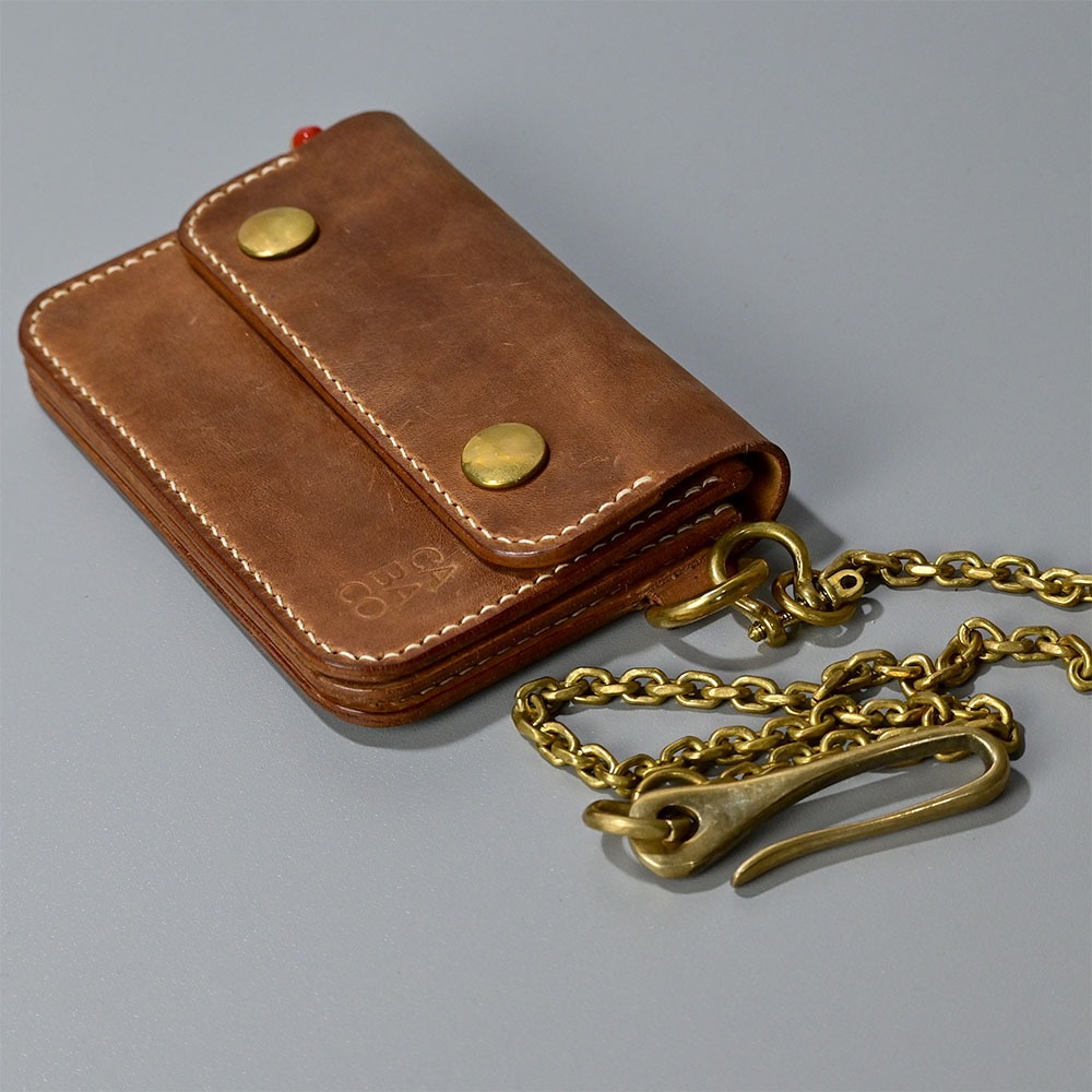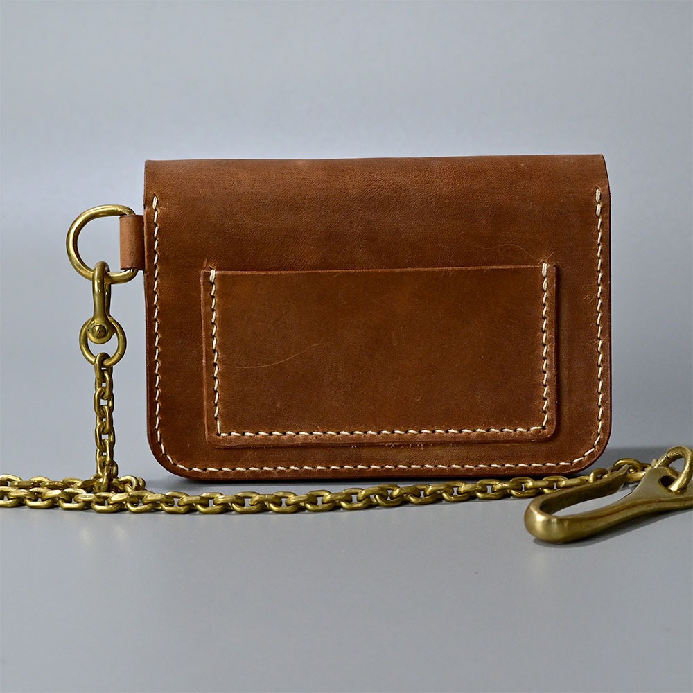 Dompet ini terbuat dari kulit sapi Crazy Horse vegetable tanned, dompet sederhana yang dapat Anda gunakan dengan aksesoris rantai dari kuningan asli. Dibuat dengan tangan, mulai dari pemotongan hingga penjahitan.