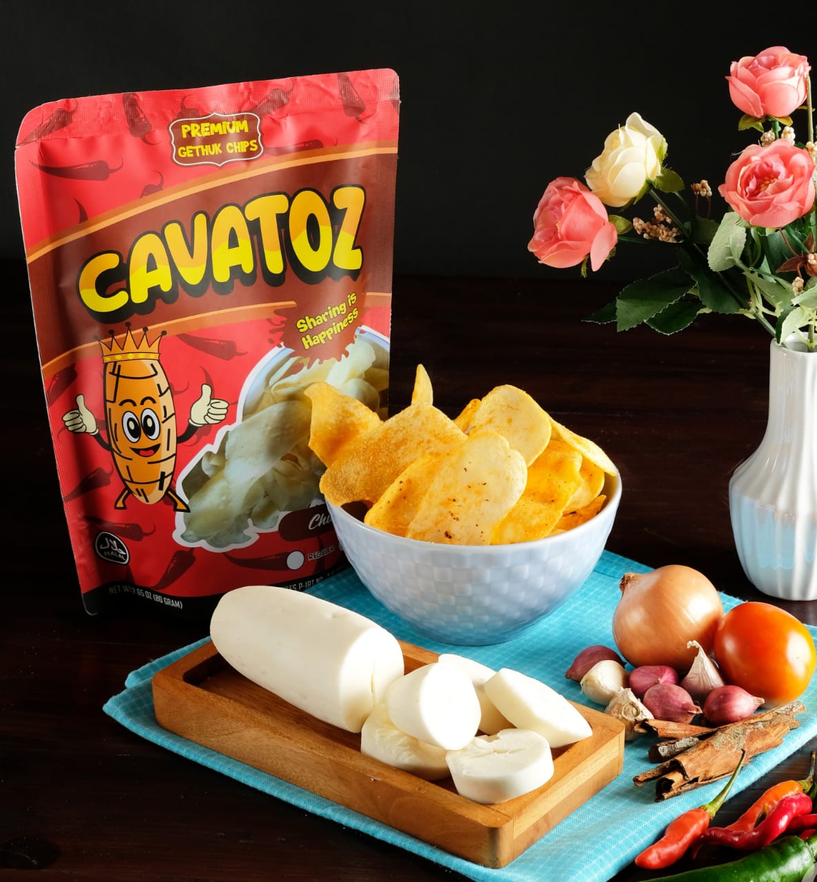 Keripik gethuk singkong dengan taburan bumbu tabur rasa pedas. Cavatoz menggunakan bumbu tabur rasa pedas yang tidak mengandung pengawet & pewarna buatan.. cocok untuk camilan Anda dan keluarga Anda! Ngemil enak tak perlu khawatir..