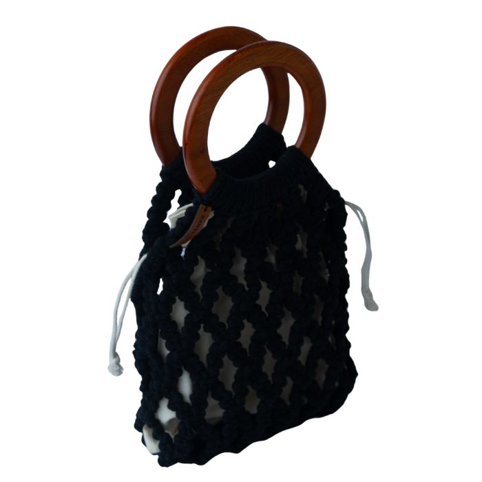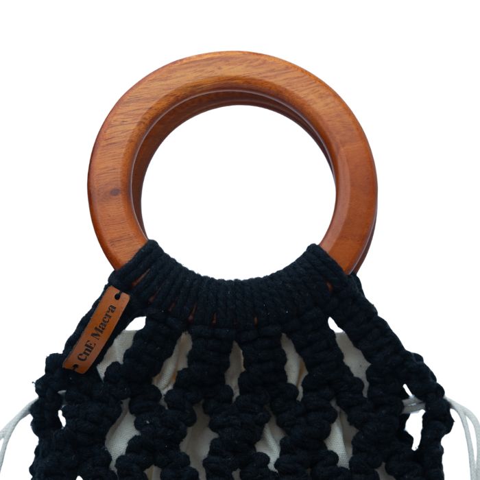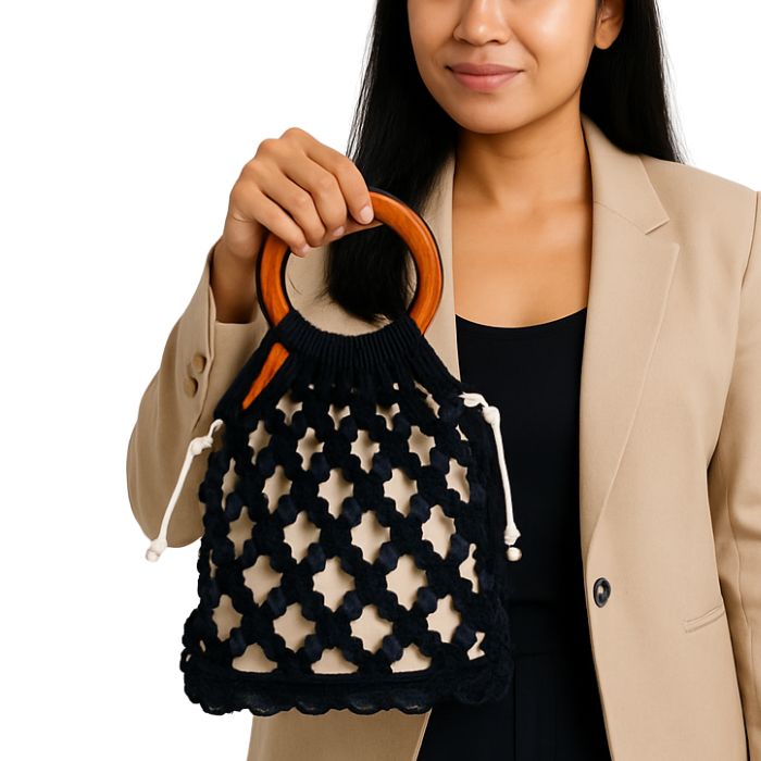 Gagang kayu bundar tidak hanya memberikan kekuatan struktural, tetapi juga menambah kesan alami dan estetis. Setiap tas dirajut dengan teliti, menjadikannya unik, fungsional, dan memiliki nilai seni tinggi.