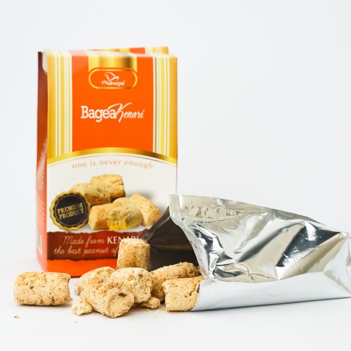 BAGEA KENARI adalah cemilan khas daerah Maluku. Menggunakan 100% pati sagu dengan campuran kenari yang telah dipotong dengan ukuran kecil. Bagea Kenari NATSEPA tidak menggunakan gula dan Rasanya gurih