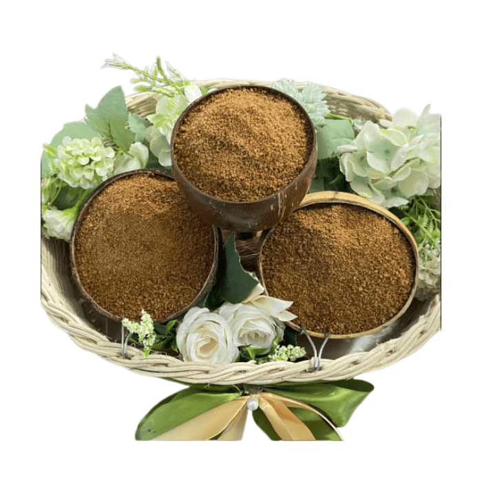 Kandungan Bahan: Dari Petani Gula Kelapa Organik Granulasi Mesh 14, kadar air ≥ 2%, Aroma normal, rasa manis menyenangkan