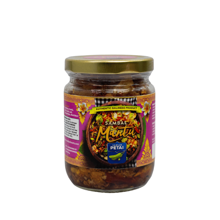 Sambal Sambal Mantu Varian Petai Original Botol memiliki level pedas STANDAR (tidak terlalu pedas). Sambal dengan isian Petai crispy di dalamnya. Sambal Mantu adalah sambal Mbe atau bawang khas Bali yang GURIH, CRISPY, TANPA MSG