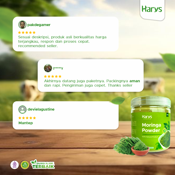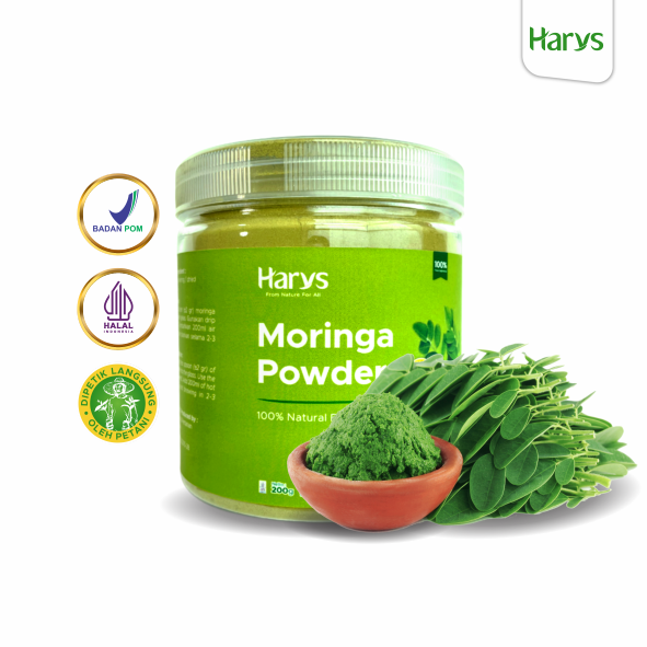 Bubuk Daun Kelor Premium HARVS terbuat dari 100% daun kelor pilihan tanpa campuran, berkualitas, dan kaya nutrisi.