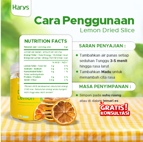 Lemon Kering Premium Harvs bisa diseduh langsung atau dipadukan dengan teh herbal POTY. Dikeringkan dengan metode dehidration process.