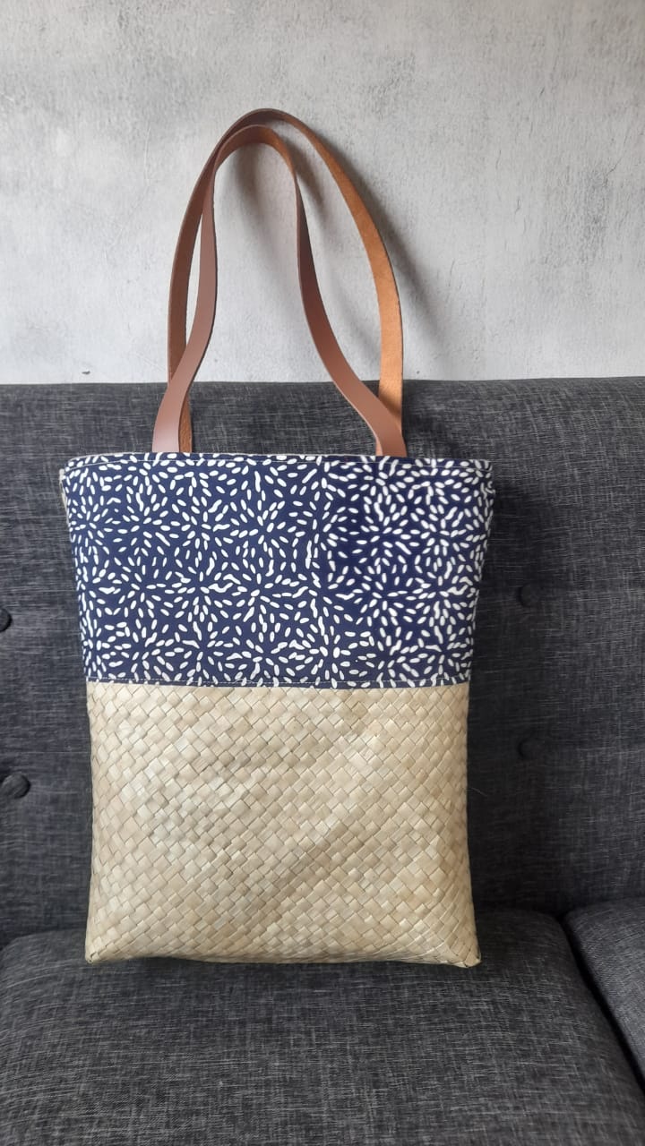 Tas terbuat dari pandan dengan kain batik sebagai aksen nya.lapisan dalam menggunakan kain suede dan handle kulut sintetis
