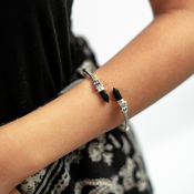Design ini Terinspirasi dari Lingga yang melambnagkan Kesuburan sehingga dikembangkan menjadi sebuah perhiasan gelang dengan di kombinasi dengan permata Onyx dan di hiasi juga dengan butiran emas 18k sehingga terlihat sangat menarik dan tegas.