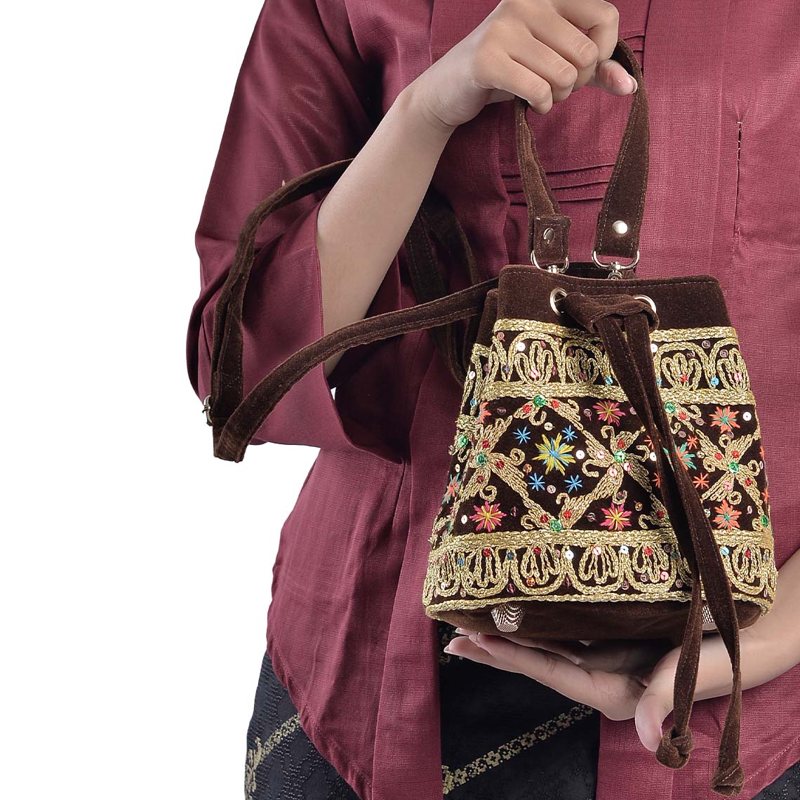 Sulam angkinan yang hampir punah, tergerak ingin melestarikan seni sulam peninggalan kerajaan sriwijaya, model bucketbag bahan beludru bersulamkan benang emas ini hadir, kesan mewah dan unik dengan warna warni benang katun terlukis indah dalam motif bunga, atau burung tersulam indah pada tas ini.