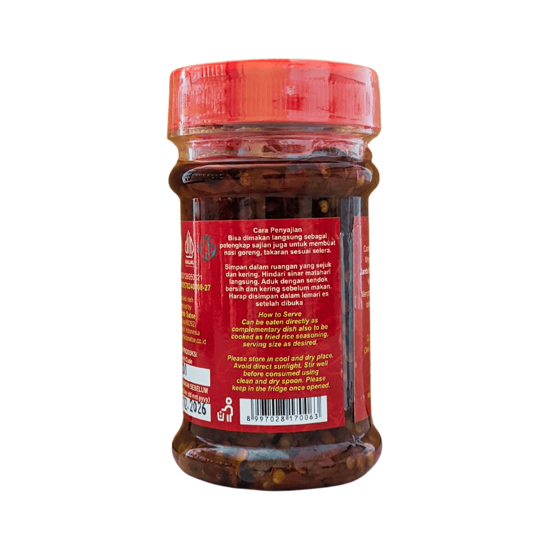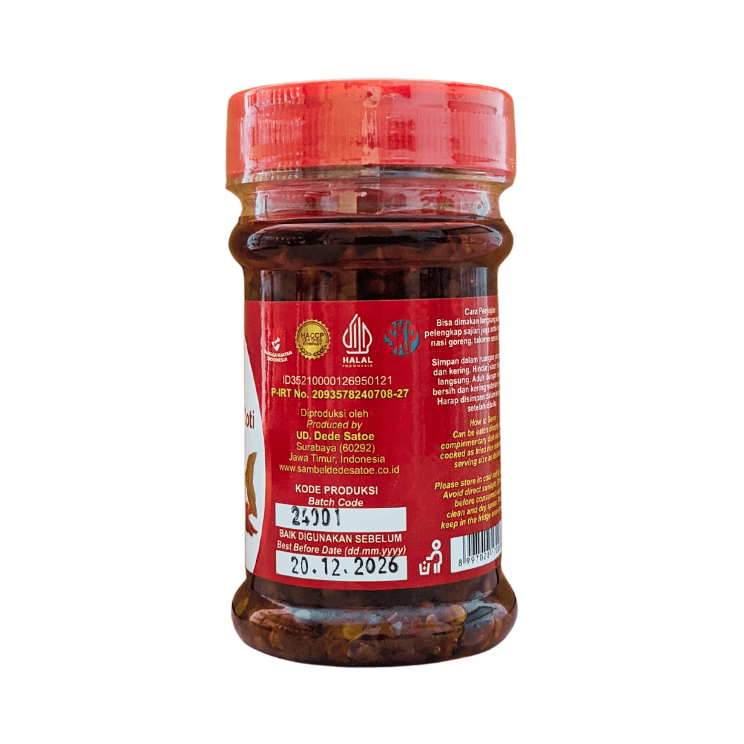 Kandungan Bahan: Cabai, bawang merah, bawang putih, garam, minyak goreng sayur, dan ikan jambal