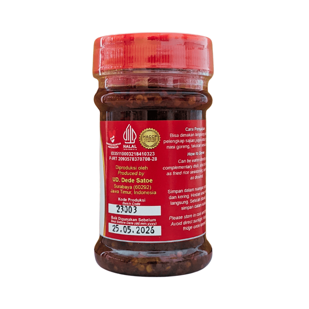 Didirikan pada bulan November 2011. Diolah menggunakan bahan baku pilihan dan berkualitas tinggi di Surabaya dan sekitarnya, dengan standar pengolahan bersertifikat HACCP, GMP, USFDA, Halal, dan lainnya. Dengan tekstur khas sambal rumahan yang bebas penyedap rasa, disajikan bagi para pecinta pedas di mana saja dan kapan saja. Dengan mengonsumsi produk kami, berarti turut berkontribusi terhadap kesejahteraan ekonomi warga sekitar Dede Satoe. Terima kasih!
