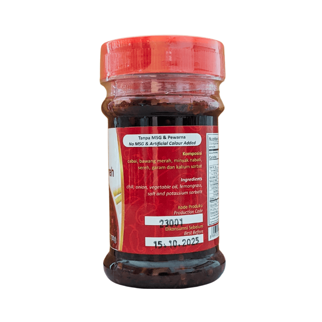 Kandungan Bahan: Cabai, bawang merah, bawang putih, garam, minyak goreng sawit, sereh