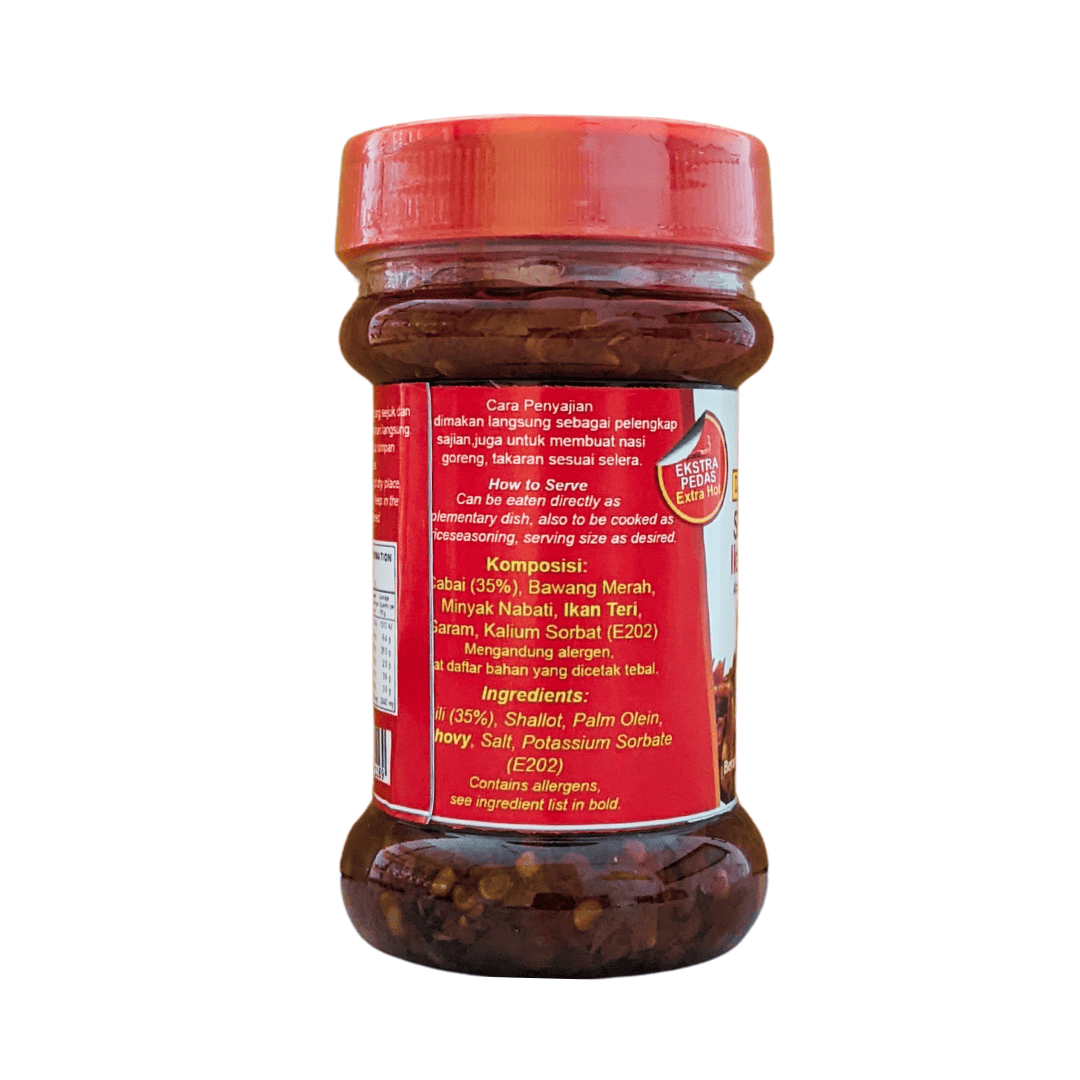 Kandungan Bahan: Cabai, bawang merah, bawang putih, garam, minyak goreng sawit, dan ikan teri