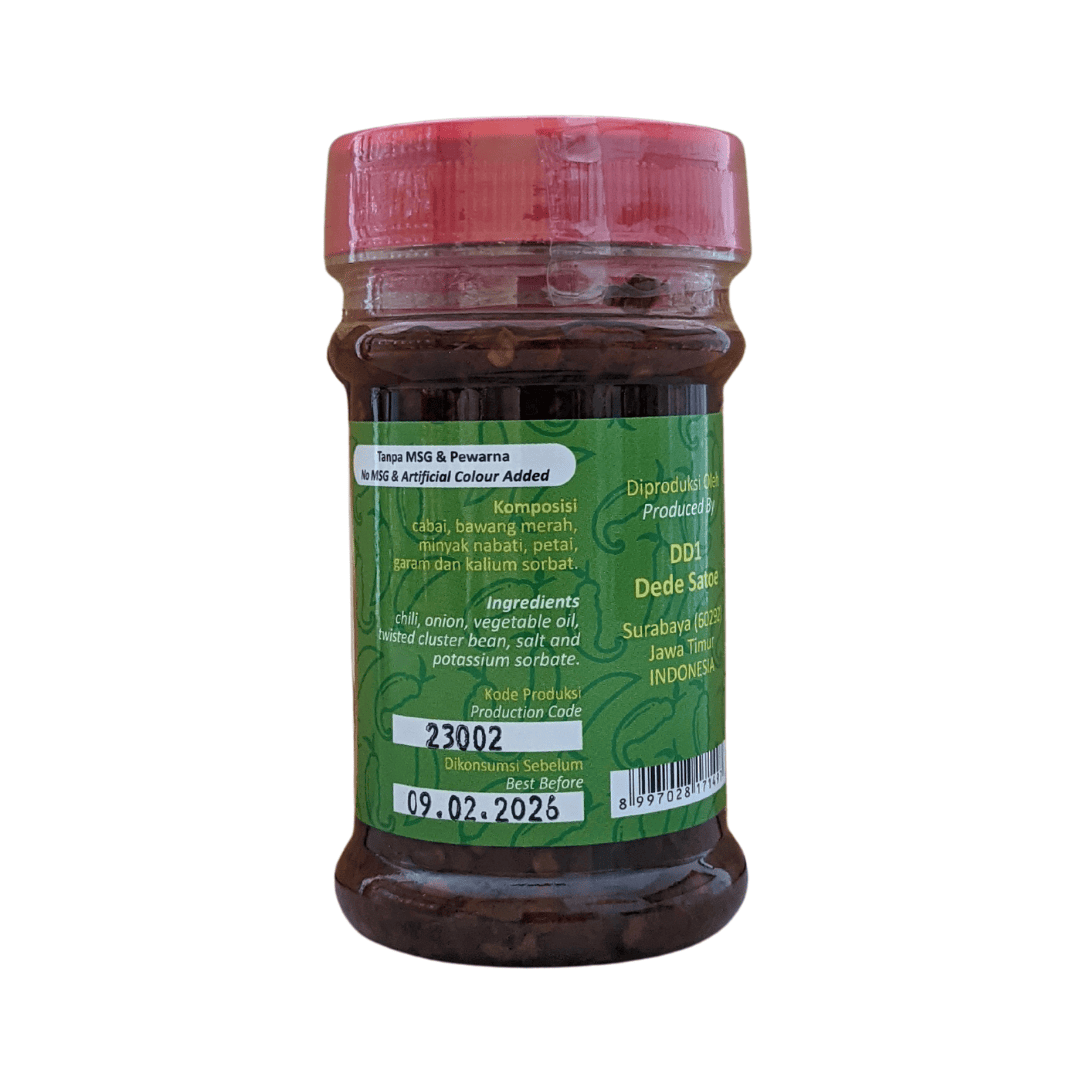Kandungan Bahan: Cabe merah, bawang merah, minyak gereng sayur, pete, potasium sorbat