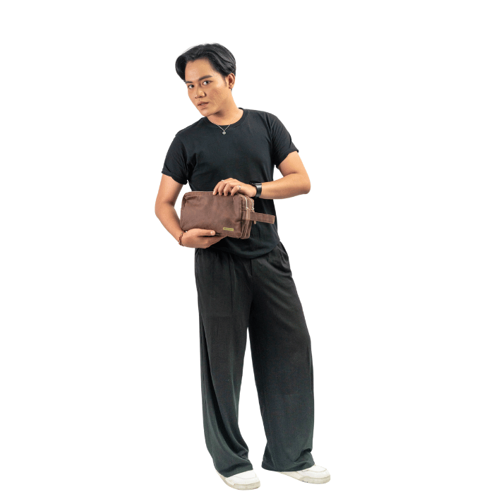 Cluth simple dengan 2 ruang berbahan kain suede coklat dengan pegangan tangan