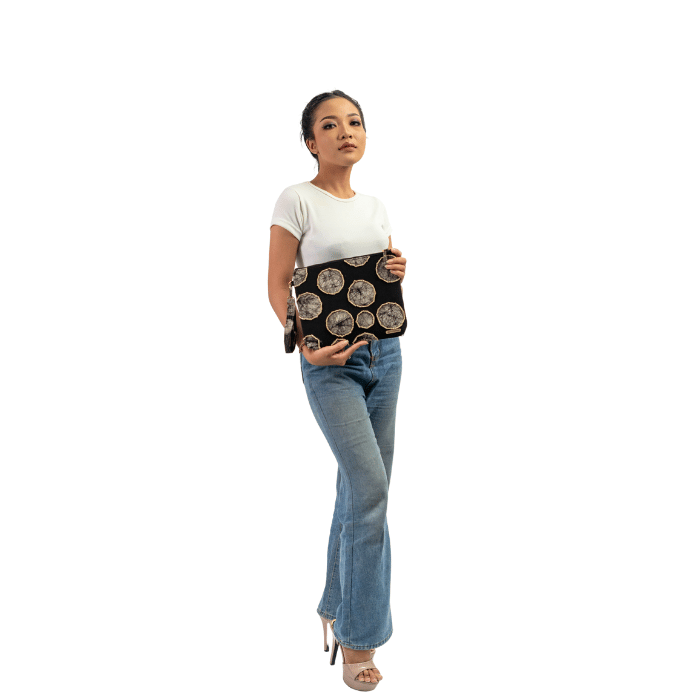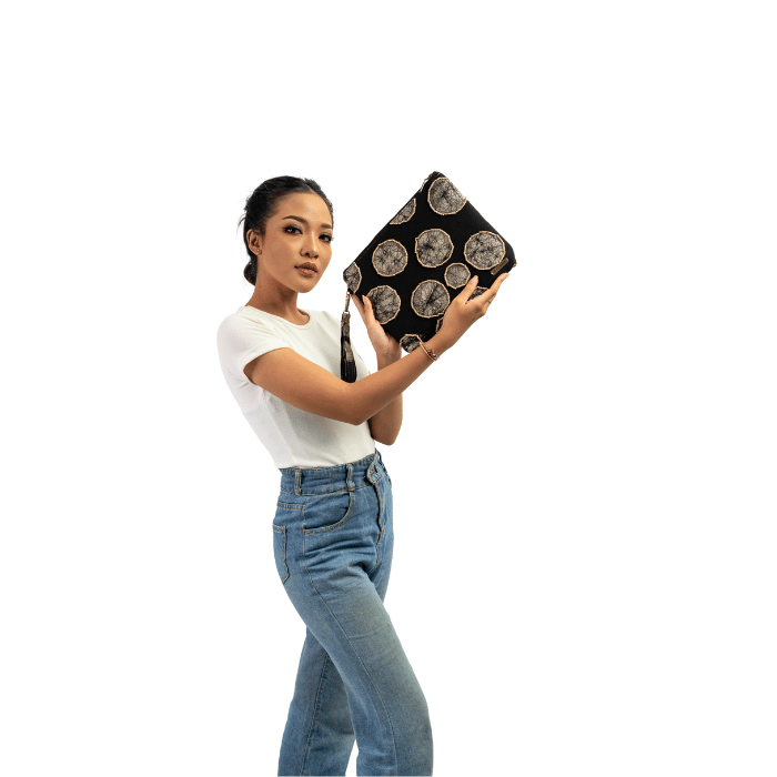 Clutch simple berbahan kain pewarna alam dan pemanis payet di bagian depan clutch