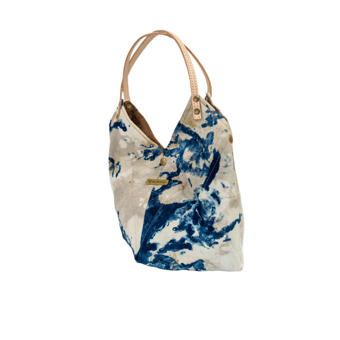 Tas model origami dengan bahan kain pewarna alam dan tali kulit sapi