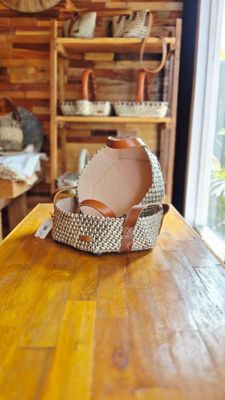 Takui, sebutan untuk bakul sebagai wadah dalam bahasa daerah Jambi, dahulu digunakan untuk membawa padi atau bahan makanan lainnya. Di d’moroy, Takui hadir dalam versi unik dengan anyaman enam sisi berbahan daun pandan hutan. Karya yang tak hanya fungsional, tetapi juga indah dan sarat makna. Ukuran diameter 28 Tinggi 7 cm.