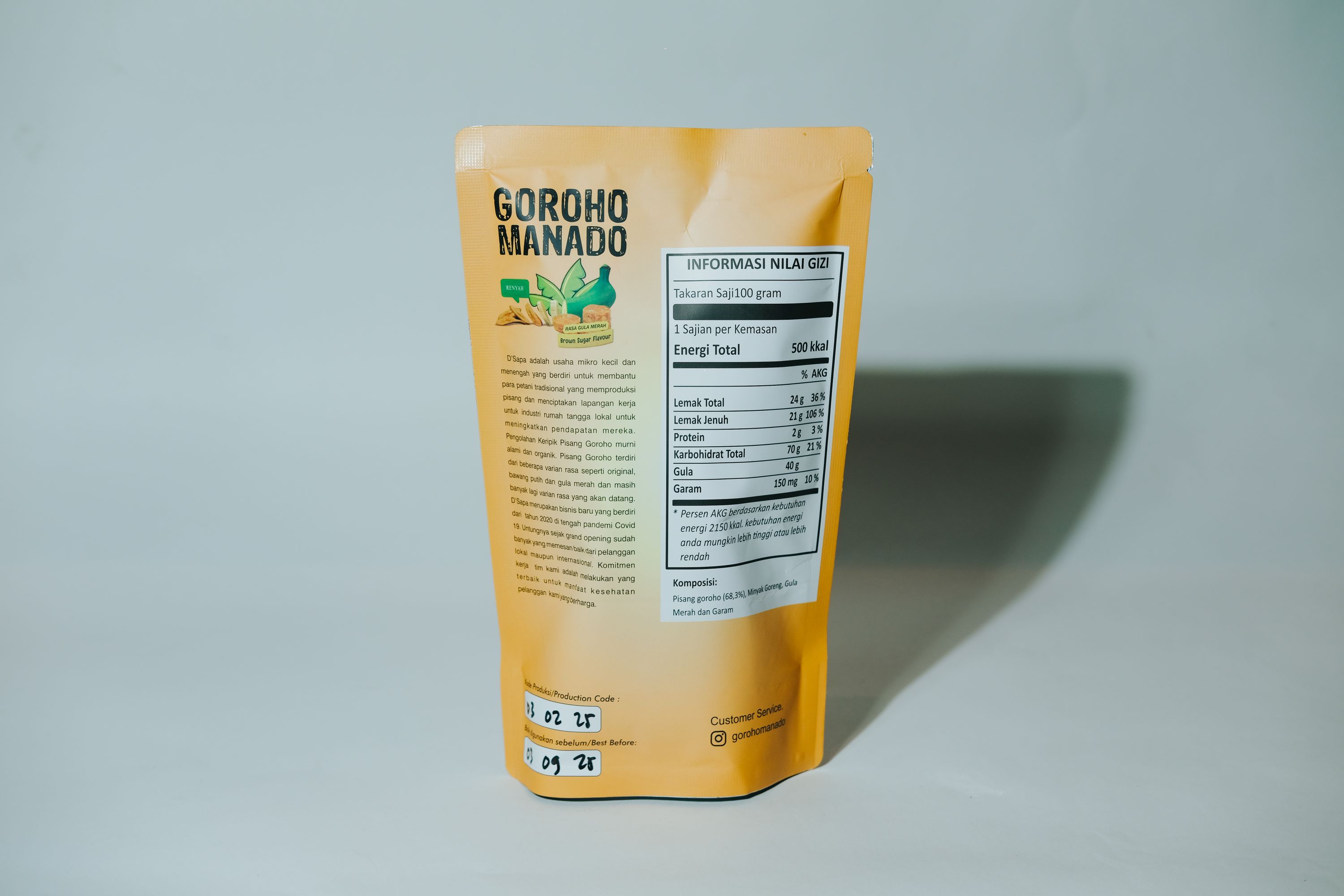 Kripik pisang goroho diambil langusng dari petani lokal, diolah dan dicampur dengan bahan baku lainnya seperti garam dan gula merah, serta di proses tanpa MSG. Diproses secara higienis dan modern, sehingga menghasilkan citarasa yang gurih dan enak.