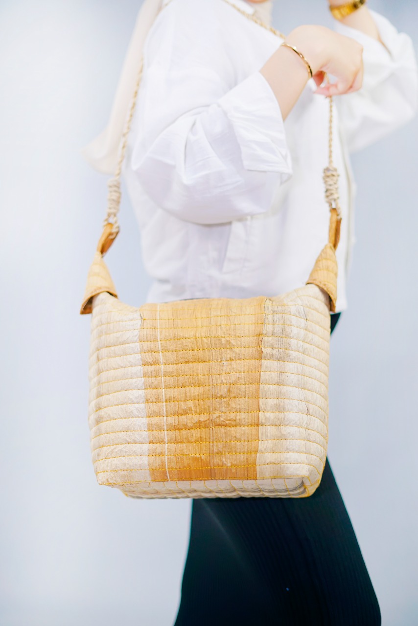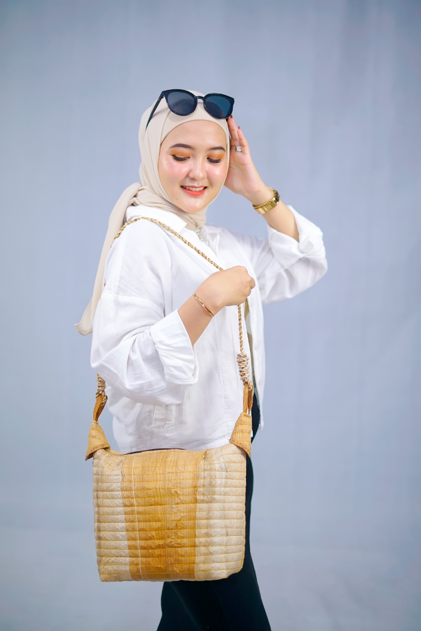 Tas santai tali panjang berbahan gedebog pisang dengan aksen kulit kayu