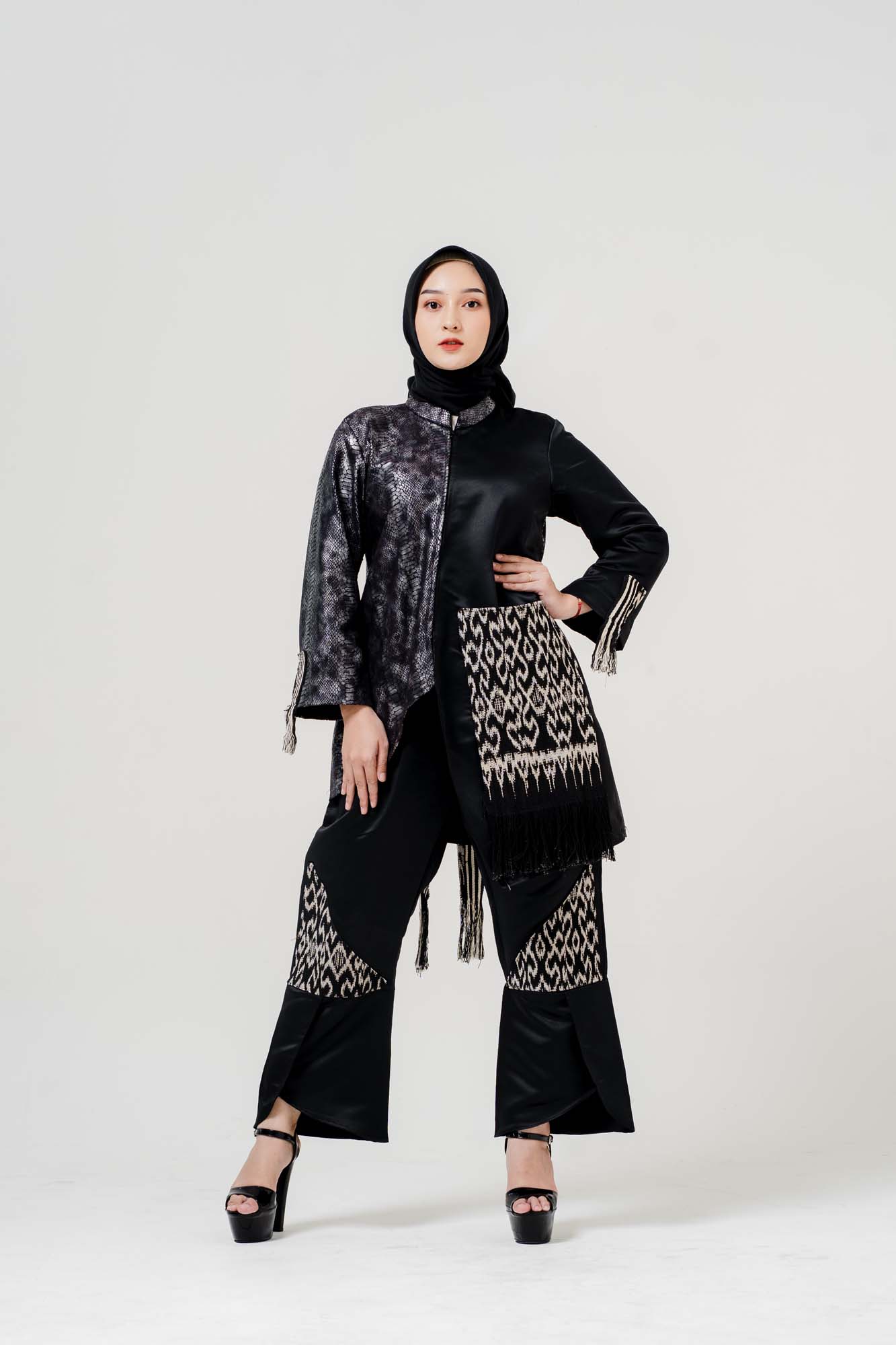 Setelan Hitam Aplikasi Tenun Ikat Sekomandi Motif Tonoling dan Tas