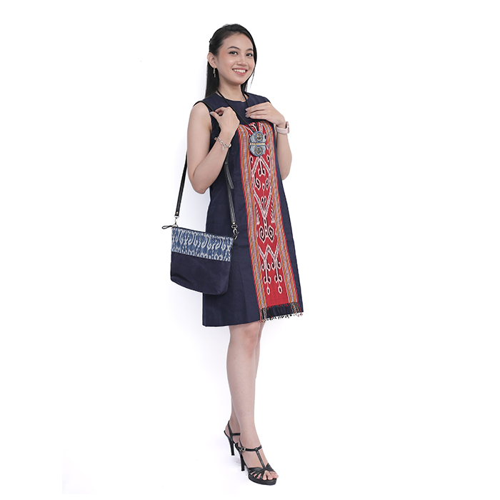 Sling bag sederhana berbahan Suede biru memanfaatkan sisa potongan kain tenun ikat untuk pola baju enak digunakan untuk sekedar jalan-jalan sore