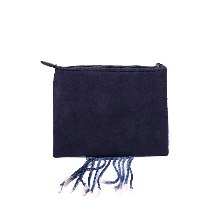 Pouch sederhana berbahan Suede biru memanfaatkan sisa potongan kain tenun ikat untuk pola baju, simpel enak digunakan