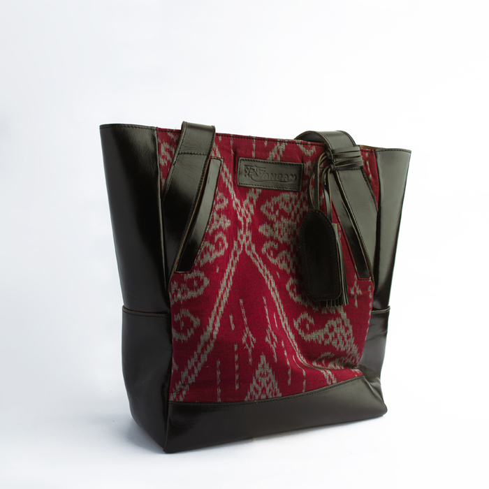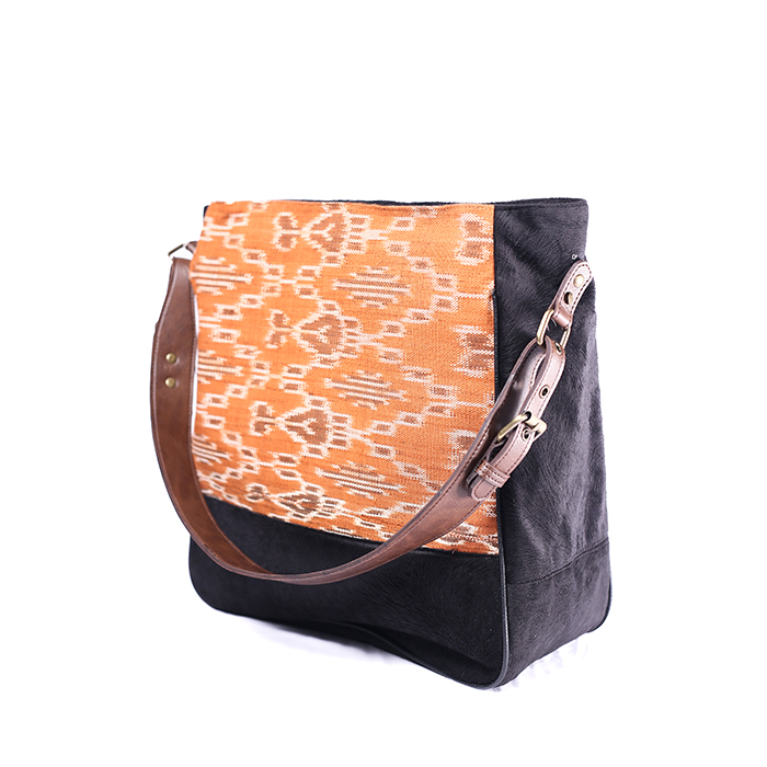 Tas tangan sederhana berbahan Suede hitam ditambah potongan kain tenun ikat, ukuran lebih besar, kapasitas banyak, enak digunakan untuk traveling