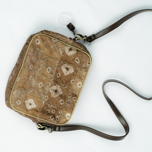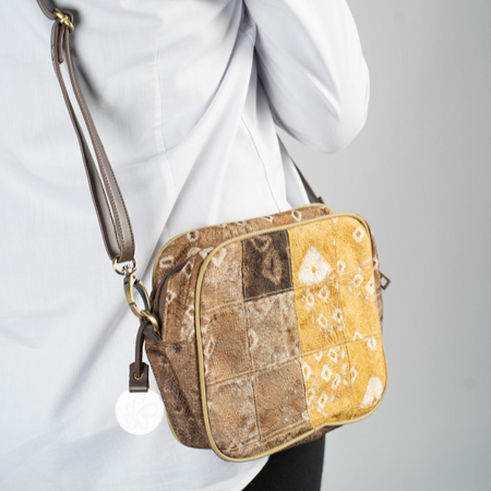 Tas ini terbuat dari Kain jumputan pewarna alam, kulit sintetis untuk tali