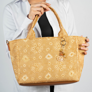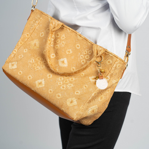 Tas ini terbuat dari kain jumputan pewarna alami ,kulit sintetis pada bagian alas