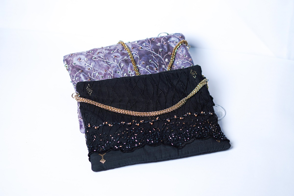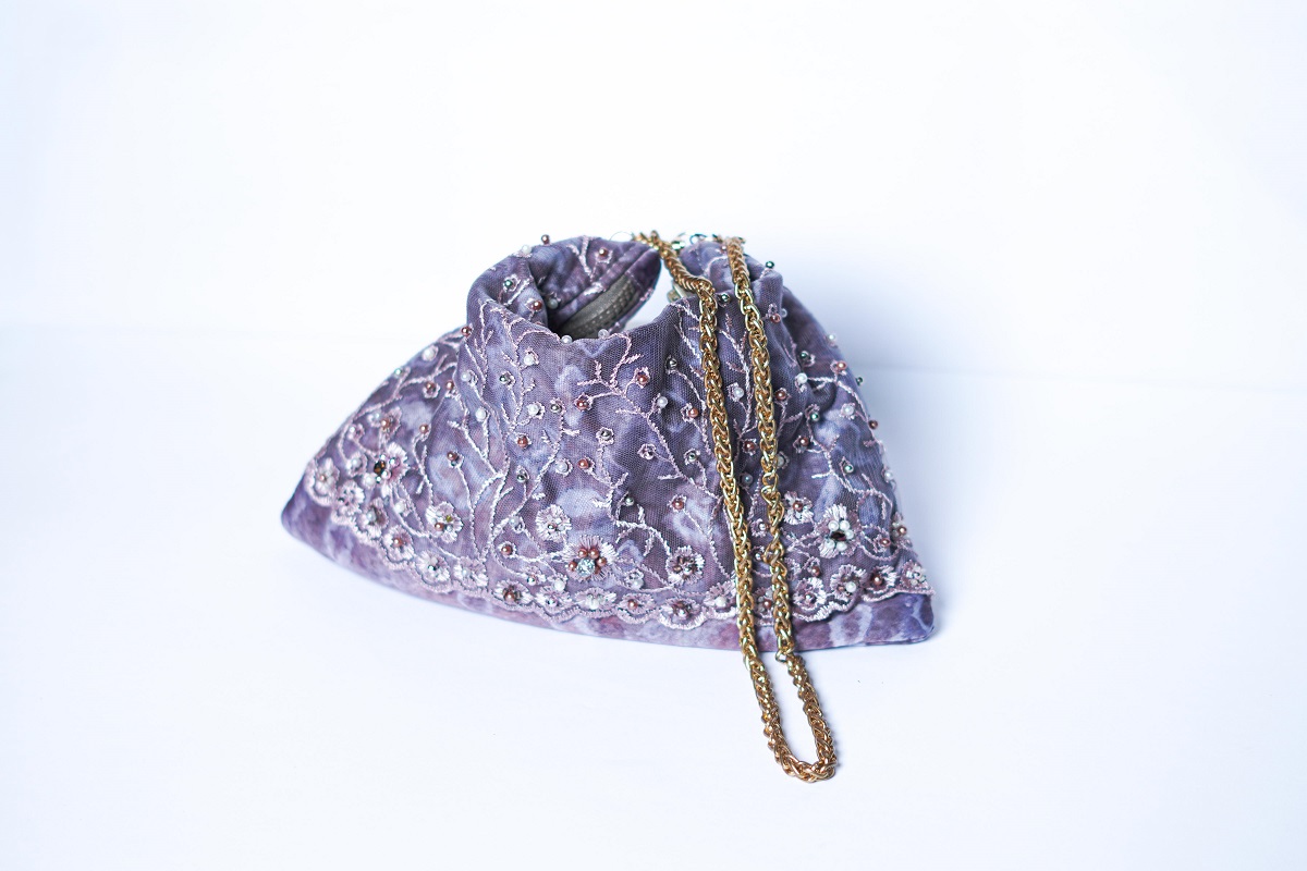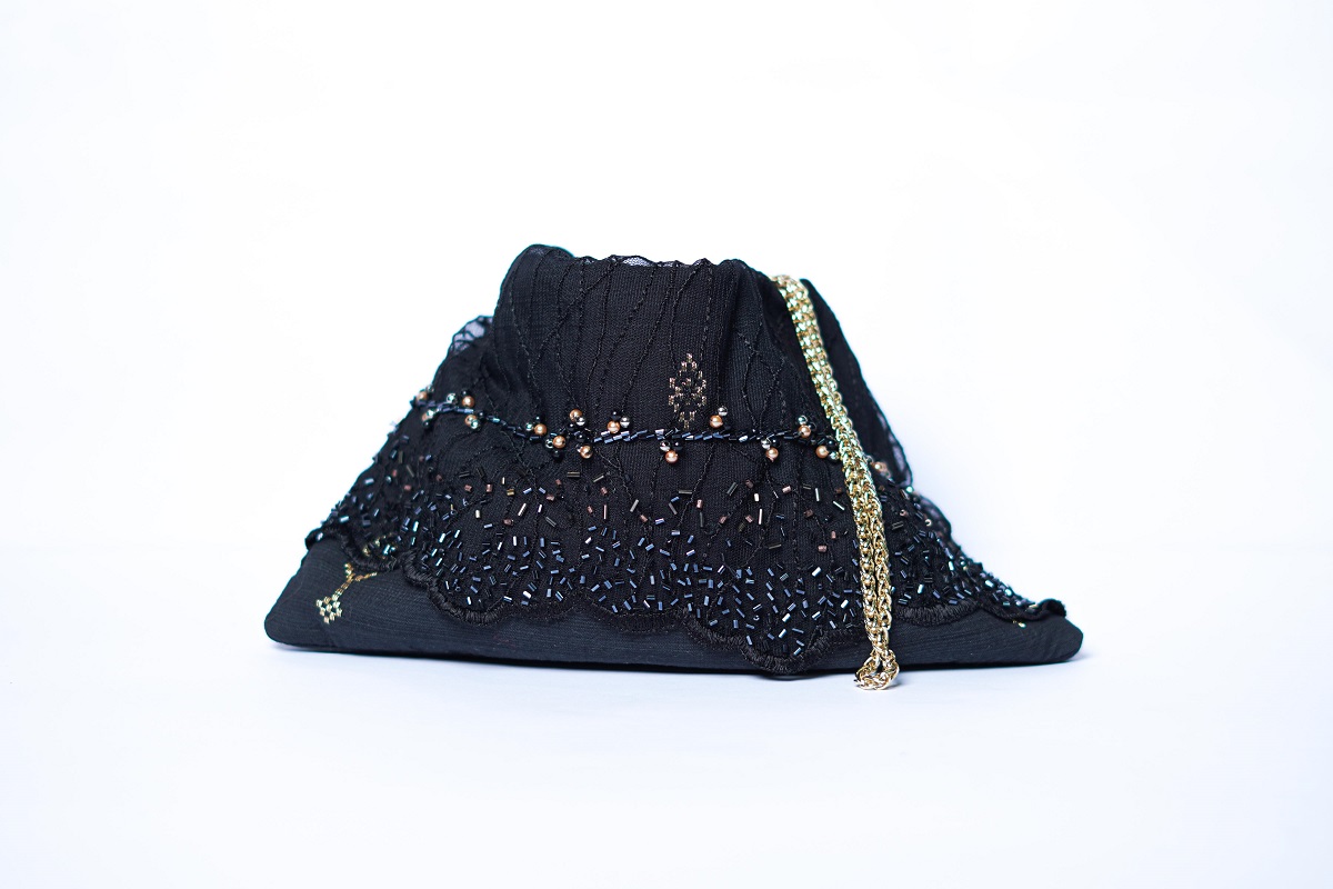 bentuknya yang tidak umum ketika di jinjing namun ketika dibuka mempunyai bentuk standar. Di buat detail oleh payet pada kain brokat.