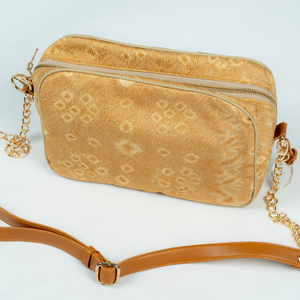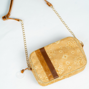 Tas ini terbuat dari Kain jumputan pewarna alam dan kulit sapi
