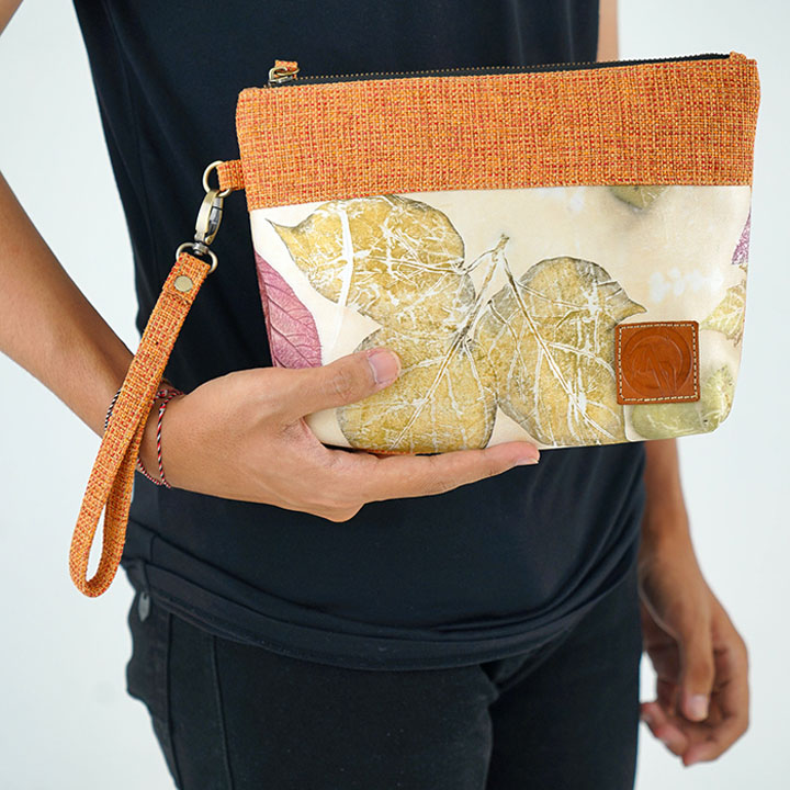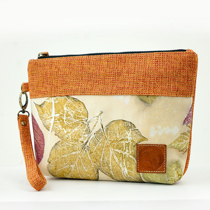 Pouch Ecoprint terbuat dari kain denim/sutra mix goni premium. Produknya mencetak motif natural (daun, bunga dan pewarna alami) yang disebut eco prints. Pekerjaan dilakukan di atas kain, dengan menggunakan produk ini diharapkan dapat mendukung kehidupan hijau dengan mengurangi pewarna sintetis yang menghasilkan polutan berbahaya bagi bumi kita. Namun, Anda tetap bisa tampil fashionable dengan menggunakan produk ini sekaligus melindungi bumi.