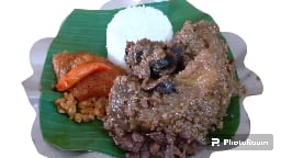 Kandungan Bahan: Nangka muda, tempe, krecek, blondo, ayam, telur , tahu, gula jawa, cabe merah, brambang bawang, garam, penyedap rasa, tumbar, salam, laos, sere, daun jeruk.