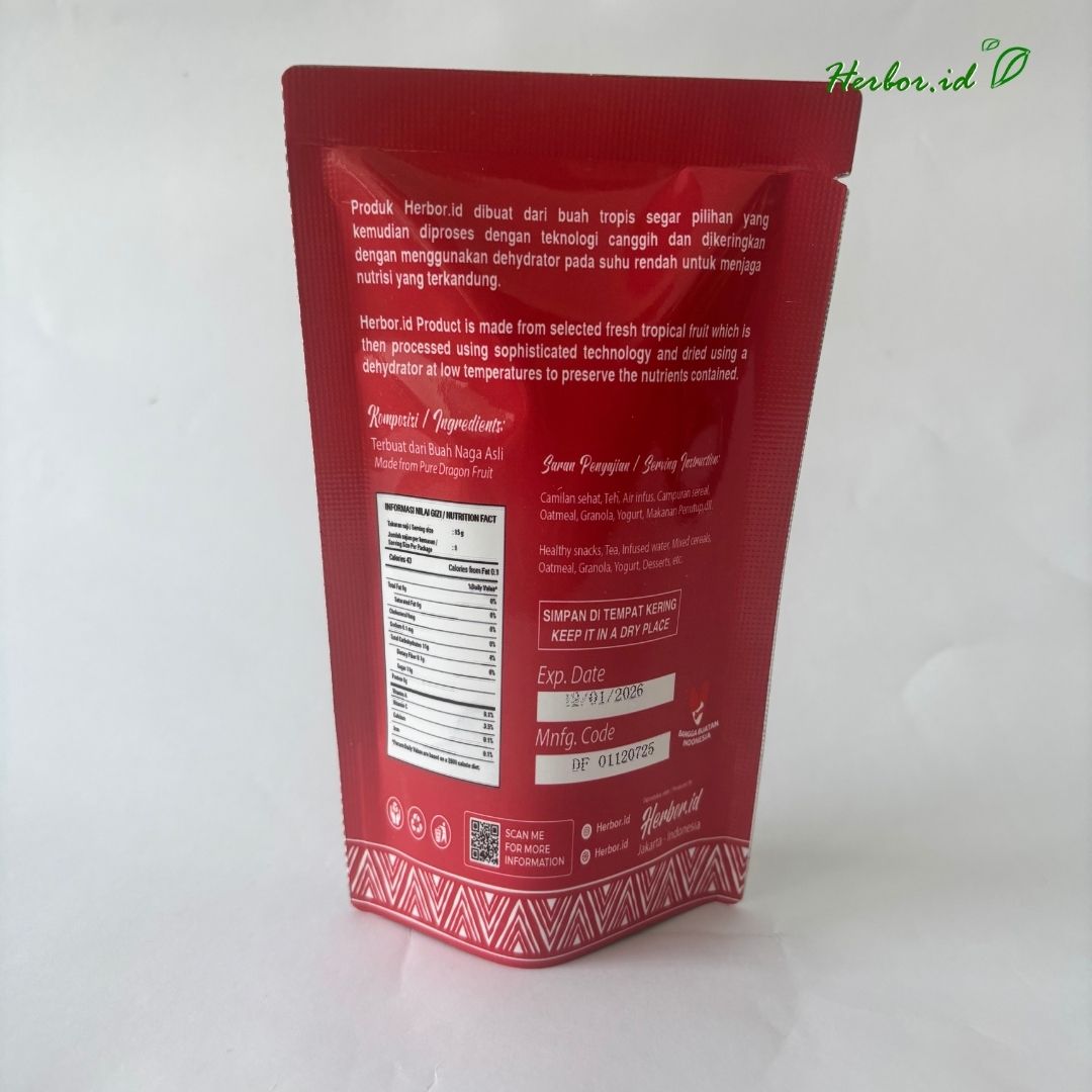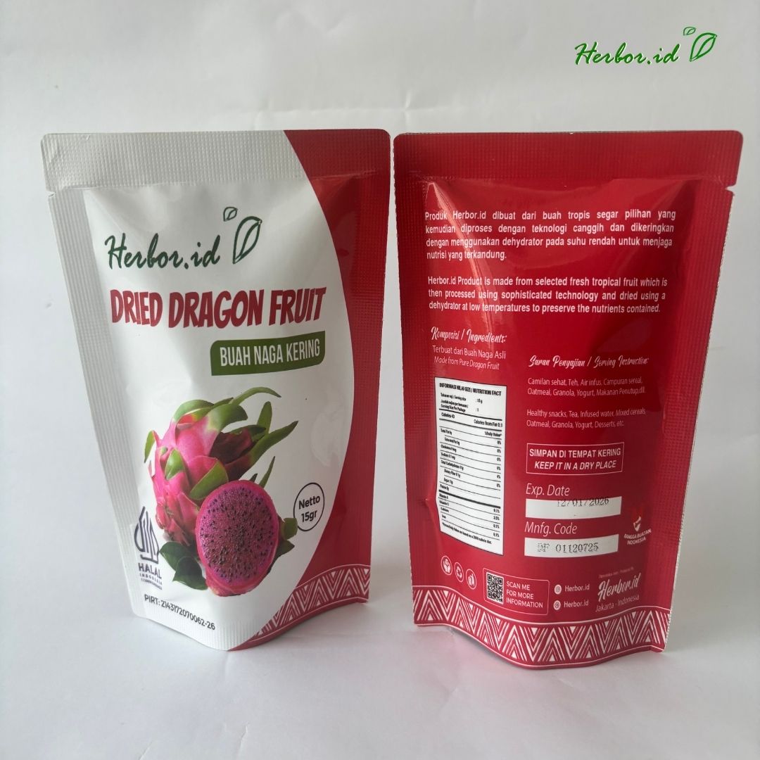Dried Dragon Fruit Herbor.id adalah camilan sehat alami yang terbuat dari 100% buah naga segar tanpa tambahan gula dan pengawet. Diproses dengan metode dehidrasi suhu rendah untuk menjaga rasa, warna, dan kandungan nutrisinya, produk ini memiliki tekstur cuwi (kenyal dan lembut) yang cocok dinikmati langsung, dijadikan topping smoothie bowl, atau sebagai campuran infused water.