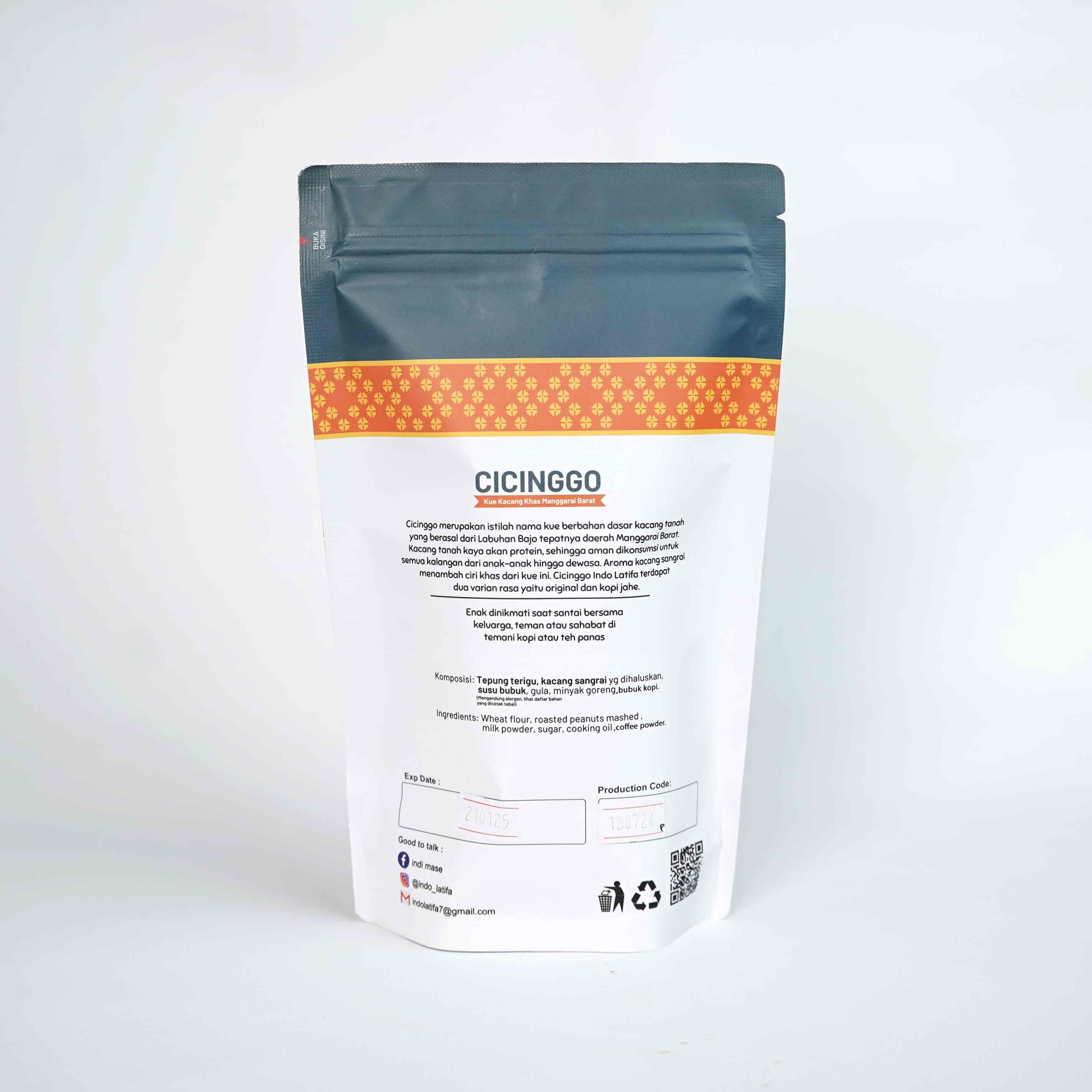 Cicinggo merupakan istilah nama kue berbahan dasar kacang tanah yang berasal dari Labuan Bajo tepatnya daerah Manggarai Barat. Kacang tanah kayak akan protein, sehingga aman dikosumsi untuk semua kalangan dari anak-anak hingga dewasa. Aroma kacang sangrai menambah ciri khas dari kue ini. Cicinggo Indo Latifa terdapat dua varian rasa yaitu Original dan Kopi.